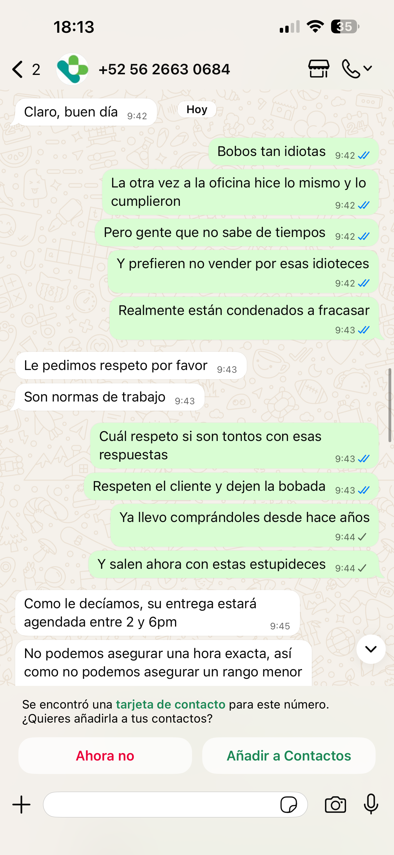 Mala atención por el Wsp, una basura quien me atendió hoy porque antes yo había pedido que me entegaran en un rango y nunca se negaron y hoy prefirieron no vender a hacer lo que el cliente requiere, espero no se repiten estas respuestas, porque ya llevo muchos pedidos y sino pues las compro en otra farmacia, muchas gracias